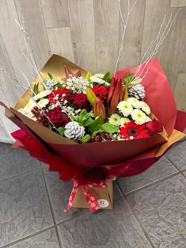 With a festive mix of rich reds, fresh greens, and crisp white blooms, this beautiful arrangement is sure to bring warmth and cheer to any Christmas celebration.